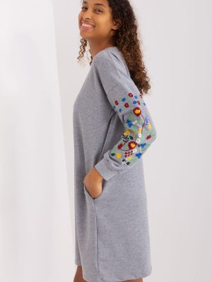 Φόρεμα με στρογγυλή λαιμόκοψη και μακριά μανίκια. Μανίκια διακοσμημένα με ενδιαφέροντα κεντήματα σε όλο το μήκος. Τσέπες στο πλάι. Ιδανικό για πολλές περιστάσεις.