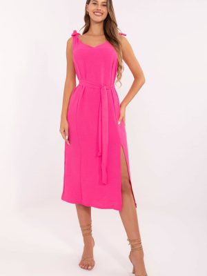 Καλοκαιρινό φόρεμα με δέσιμο στους ώμους, με ζώνη στη μέση. Στο μπροστινό μέρος έχει εντυπωσιακή σχισμή. Πρόταση για πολλές περιστάσεις.