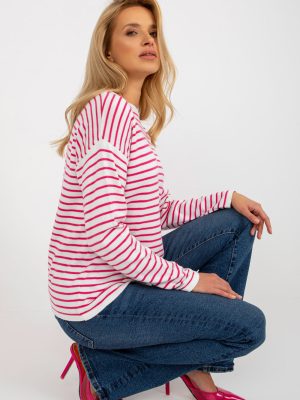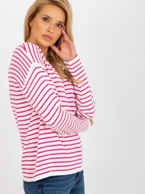 Γυναικείο πουλόβερ σε κλασικό κόψιμο με πολύχρωμες ρίγες, μακριά μανίκια και στρογγυλή λαιμόκοψη.