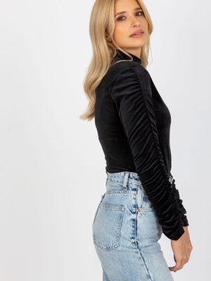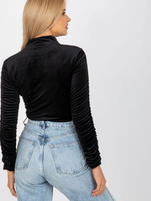 Μακρυμάνικη βελουτέ μπλούζα με όρθιο γιακά. Μανίκια διακοσμημένα με πτυχή.