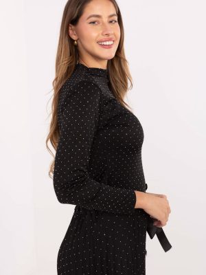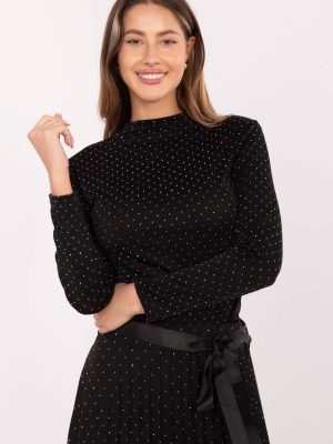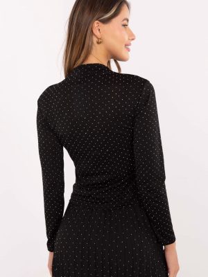 Αυτή η κομψή γυναικεία μπλούζα είναι πρόταση για γυναίκες που εκτιμούν το στυλ και τη διακριτική λάμψη σε κάθε επίσημη περίσταση ή κατά τη διάρκεια εξόδων σε πάρτι. Το μοντέλο είναι εφαρμοστό, με κανονικό μήκος, μακριά μανίκια και κλασικό μισό-γκόλφ, γεγονός που του προσφέρει κομψό χαρακτήρα. Κατασκευασμένη από μαλακό μείγμα βισκόζης και πολυεστέρα, η μπλούζα είναι ευχάριστη στην αφή, ελαστική και άνετη στην κατανάλωση. Ολόκληρη η επιφάνεια διακοσμείται με διακοσμητικά τζετ που προσφέρουν διακριτική λάμψη και μοναδική γοητεία σε κάθε στυλ. Η απουσία κλεισίματος καθιστά την μπλούζα πρακτική και εύκολη στην τοποθέτηση, ενώ η κλασική της γραμμή επιτρέπει το συνδυασμό με διάφορες φούστες, παντελόνια ή κομψά επίσημα παντελόνια.