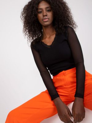 Μπλούζα με γραμμή από ύφασμα με ραβδώσεις. Μπλούζα με μακριά διαφανή μανίκια και λαιμόκοψη V.