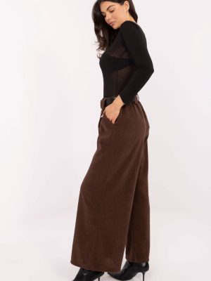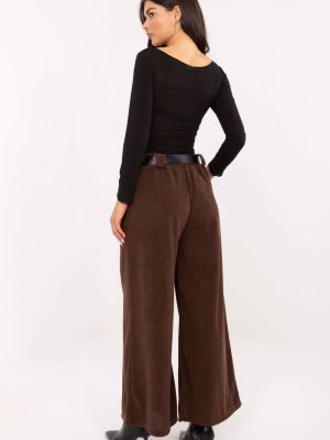 Στυλάτους παντελόνια υφασμάτινα με κομψό χαρακτήρα, ιδανικά για καθημερινές δραστηριότητες και για τη δουλειά. Κατασκευασμένα από απαλό βελούδο με ποικιλόμορφη υφή υλικού, εξασφαλίζουν εξαιρετική άνεση κατά την εφαρμογή και κομψή εμφάνιση. Το μοντέλο διαθέτει ψηλή μέση και φαρδιά πόδια, τα οποία διαμορφώνονται όμορφα πάνω στη σιλουέτα, κάνοντάς την οπτικά πιο λιτή. Στη μέση υπάρχει ραμμένη ελαστική ζώνη, που εξασφαλίζει άνετη εφαρμογή, ενώ η ρυθμιζόμενη ζώνη επιτρέπει επιπλέον ρύθμιση της περιφέρειας. Το παντελόνι δεν διαθέτει κούμπωμα, κάτι που αυξάνει την άνεση της χρήσης. Οι πλάγιες, εισαγόμενες τσέπες προσθέτουν λειτουργικότητα και κομψότητα. Είναι μια εξαιρετική επιλογή για γυναίκες που εκτιμούν τον συνδυασμό της κομψότητας, της άνεσης και του σύγχρονου στυλ.