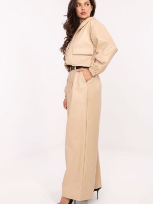 Στυλάτα και άνετα παντελόνια τύπου palazzo, κατασκευασμένα από υψηλής ποιότητας οικολογικό δέρμα (συνδυασμός πολυεστέρα και πολυουρεθάνης). Το μοντέλο με τις φαρδιές παντελόνες και τη υψηλή μέση αναδεικνύει τέλεια την μέση, ενώ παρέχει ταυτόχρονα ελευθερία κινήσεων. Στη μέση έχει ραμμένο ελαστικό λάστιχο, χάρη στο οποίο τα παντελόνια προσαρμόζονται ιδανικά στη σιλουέτα. Επιπλέον, διαθέτουν ζώνη με κούμπωμα, που επιτρέπει την ανάδειξη της σιλουέτας και προσθέτει σε όλο το σύνολο έναν κομψό τόνο. Το μοντέλο έχει πλευρικές τσέπες και λείο υλικό, δίνοντάς του έναν σύγχρονο, μινιμαλιστικό χαρακτήρα. Είναι ιδανική πρόταση σε casual στυλ, κατάλληλη τόσο για καθημερινές εμφανίσεις όσο και για τη δουλειά, εξασφαλίζοντας άνεση και κομψή εμφάνιση καθ’ όλη τη διάρκεια της ημέρας.