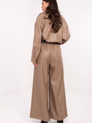 Στυλάτα και άνετα παντελόνια τύπου palazzo, κατασκευασμένα από δερματίνη υψηλής ποιότητας (συνδυασμός πολυεστέρα και πολυουρεθάνης). Το μοντέλο με φαρδιές ίνες και ψηλή μέση αναδεικνύει όμορφα τη μέση, διασφαλίζοντας ταυτόχρονα ελευθερία κινήσεων. Στη μέση έχει ραμμένο ελαστικό λάστιχο, που επιτρέπει στο παντελόνι να προσαρμόζεται τέλεια στη σιλουέτα. Επιπλέον, διαθέτει ζώνη με κλείσιμο, που αναδεικνύει τη σιλουέτα και προσθέτει μια κομψή νότα στο σύνολο. Το μοντέλο έχει πλάγιες τσέπες και λεία επιφάνεια υφάσματος, που του προσδίδουν σύγχρονο, μινιμαλιστικό χαρακτήρα. Είναι η ιδανική πρόταση σε casual στυλ, κατάλληλη τόσο για καθημερινή χρήση όσο και για τη δουλειά, εξασφαλίζοντας άνεση και μοντέρνα εμφάνιση καθόλη τη διάρκεια της ημέρας.