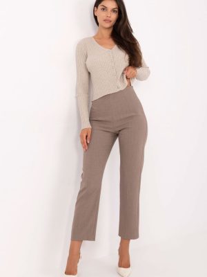 Οι κομψές γυναικείες παντελόνες τύπου cigarette είναι ένα κλασικό ρούχο που θα ταιριάζει σε πολλές στυλιστικές επιλογές, είτε καθημερινές, είτε για την εργασία, είτε για επίσημες περιστάσεις. Κατασκευασμένες από υψηλής ποιότητας πολυεστέρα με προσθήκη ελαστάνης, εξασφαλίζουν άνεση στη χρήση και προσαρμόζονται ελαφρώς στη σιλουέτα. Το μοντέλο με ψηλή μέση τονίζει όμορφα τη μέση, ενώ οι κωνικές κνήμες τονίζουν τα πόδια, δίνοντας συνολικά μια κομψή αίσθηση. Τα παντελόνια κλείνουν με έναν κρυφό φερμουάρ που τοποθετείται από την αριστερή πλευρά, εξασφαλίζοντας μια αισθητική και κομψή φινέτσα. Ο μινιμαλιστικός, λείος σχεδιασμός κάνει τις cigarette να γίνουν μια καθολική βάση για πολλές κομψές και σύγχρονες εμφανίσεις.
