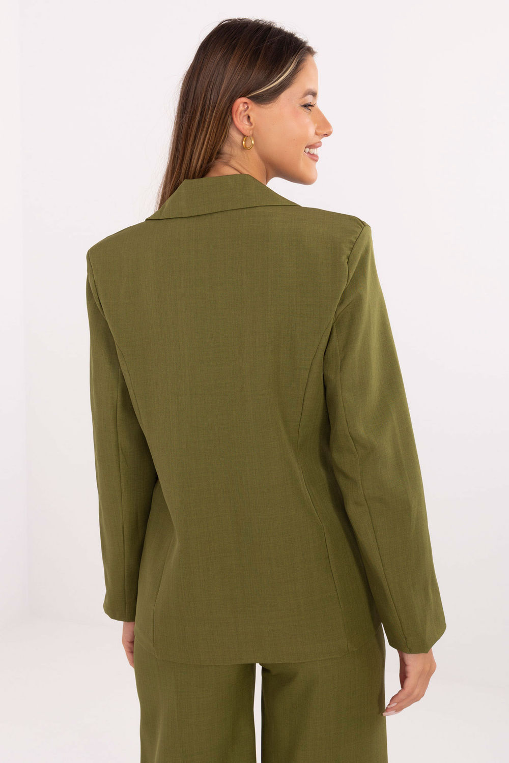 Το κομψό γυναικείο σακάκι σε στάνταρ μήκος είναι η ιδανική επιλογή τόσο για την εργασία όσο και για επιχειρηματικές συναντήσεις ή καθημερινές εμφανίσεις με στυλ. Το μοντέλο που κλείνει με κουμπί διαθέτει ραμμένα μαξιλαράκια στους ώμους, που προσδίδουν στη σιλουέτα έντονο χαρακτήρα και κομψή γραμμή. Το σακάκι ξεχωρίζει για τον ομαλό ύφασμα και την διακοσμητική καρφίτσα στο πέτο, ενώ οι μιμήσεις τσεπών κάτω από τα καπάκια τονίζουν την κλασική κοπή και προσθέτουν μια διακριτική κομψότητα. Το μακρύ μανίκι και το εσωτερικό φόρεμα διασφαλίζουν άνεση και αισθητική εμφάνιση. Κατασκευασμένο από υψηλής ποιότητας πολυέστερ με προσθήκη ελαστάνης, εγγυάται άνεση κατά τη διάρκεια της χρήσης και εξαιρετική εφαρμογή. Είναι ένα διαχρονικό κομμάτι ένδυσης που ταιριάζει τέλεια με παντελόνια, φούστες ή φορέματα, δημιουργώντας θηλυκές και επαγγελματικές εμφανίσεις.