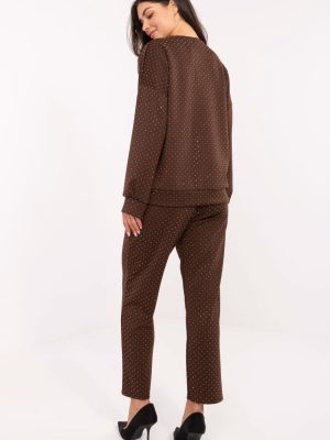 Μια κομψή και άνετη γυναικεία φόρμα είναι πρόταση για τις γυναίκες που εκτιμούν την κομψότητα στην καθημερινότητά τους. Το σετ αποτελείται από ένα φούτερ και παντελόνια, δημιουργώντας μια αρμονική σύνολο με ιδιαίτερα γυναικεία χαρακτηριστικά. Το μοντέλο έχει κατασκευαστεί από μαλακό μείγμα βισκόζης και πολυεστέρα, που προσαρμόζεται τέλεια στη σιλουέτα, προσφέροντας άνεση στη χρήση και αισθητική εμφάνιση. Όλη η επιφάνεια του υλικού διακοσμείται με διακριτική εφαρμογή από στρας, προσδίδοντας στο σετ κομψό, επίσημο στυλ. Τα παντελόνια με ψηλή μέση, ίσιες, μακριές ποδιές και δέσιμο στη μέση αναδεικνύουν τη μέση και εξασφαλίζουν ιδανική εφαρμογή. Οι πλάγιες, κρυφές τσέπες προσθέτουν πρακτικότητα και χαλαρότητα στην καθημερινή χρήση. Αυτό το σετ είναι ιδανικό για πολλές περιστάσεις, είναι κατάλληλο για δουλειά, συναντήσεις καθώς και για καθημερινή χρήση. Συνδυάζει την άνεση της φόρμας με την κομψότητα του επίσημου στυλ, δημιουργώντας μια универсική και σύγχρονη εμφάνιση.
