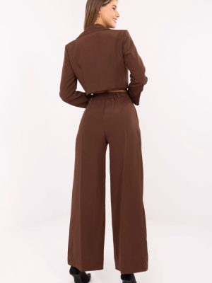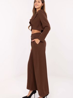 Μια στιλάτη γυναικεία εμφάνιση που αποτελείται από μια κοντή σακάκι και μακριά παντελόνια είναι η ιδανική πρόταση για γυναίκες που εκτιμούν τον συνδυασμό κομψότητας και άνεσης. Η σακάκι με πέτο και γιακά κλείνει με κουμπί, ενώ οι ραμμένες μαξιλαροθήκες στους ώμους προσδίδουν στην σιλουέτα μια έντονη, γυναικεία μορφή και την διαμορφώνουν ελαφρώς. Τα παντελόνια με μακριές, φαρδιές γραμμές και ψηλή μέση υπογραμμίζουν τέλεια τη μέση και οπτικά επιμηκύνουν τα πόδια. Το κλείσιμο με φερμουάρ και κουμπί εξασφαλίζει άνεση κατά τη διάρκεια της φόρεσης, ενώ οι πλαϊνές τσέπες προσθέτουν πρακτικότητα. Το σύνολο εντυπωσιάζει με την προσεγμένη γραμμή και τον καθολικό του χαρακτήρα, είναι ιδανικό τόσο για καθημερινές εμφανίσεις όσο και για πιο κομψές στυλιστικές επιλογές. Ιδανική επιλογή για το γραφείο, για συναντήσεις ή για βόλτες μετά τη δουλειά.