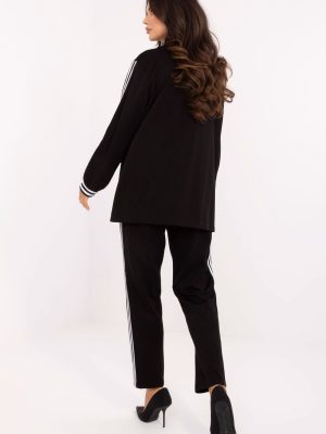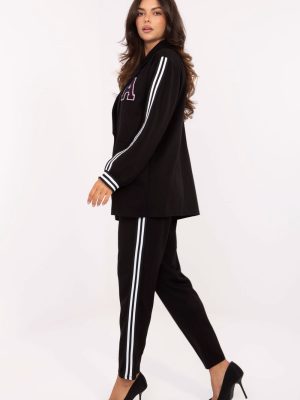 Το γυναικείο σετ σε στυλ casual είναι ο ιδανικός συνδυασμός άνεσης και μοντέρνας εμφάνισης. Ραμμένο από υλικό τύπου βούτυρο, εξαιρετικά μαλακό, απαλό και ευχάριστο στην αφή, παρέχει μέγιστη άνεση στη διάρκεια της χρήσης. Το σακάκι με κουμπί και μακριά μανίκια είναι διακοσμημένο με διακοσμητικές ρίγες και ένα εμβληματάκι στο ύψος του στήθους, δίνοντας συνολικά μια μοντέρνα, σπορ-κομψή αίσθηση. Το παντελόνι με κωνικές ραφές και ψηλή μέση διαθέτει πρακτικές πλαϊνές τσέπες και κορδόνι στη μέση, που επιτρέπει την προσαρμογή του στη σιλουέτα. Οι ρίγες κατά μήκος των ποδιών υπογραμμίζουν το δυναμικό στυλ του σετ. Το σετ είναι ιδανικό για καθημερινή χρήση, απλό, στυλάτο και εξαιρετικά άνετο.