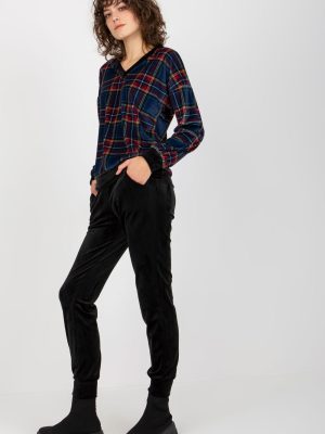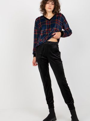 Γυναικείο βελούδινο σετ που αποτελείται από μπλούζα και παντελόνι. Μακρυμάνικη μπλούζα από ενδιαφέρον καρό ύφασμα. Μακρύ μαύρο παντελόνι με τσέπες.