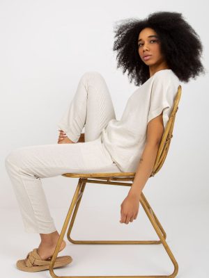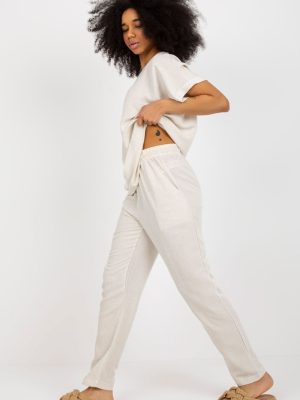 Καλοκαιρινό σετ που αποτελείται από μπλούζα και παντελόνι. Μπλούζα με κοντά μανίκια και στρογγυλή λαιμόκοψη. Μακρύ παντελόνι με γραβάτα στη μέση και τσέπες με τρυπούλες.