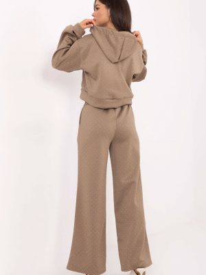 Η κομψή και άνετη γυναικεία φόρμα αποτελεί την ιδανική σύνθεση κομψότητας και άνεσης για κάθε μέρα. Το σετ αποτελείται από ένα φούτερ με φερμουάρ και κουκούλα, συμπεριλαμβανομένων των κορδονιών, και ένα παντελόνι με λάστιχο στη μέση, δημιουργώντας ένα μοντέρνο αλλά και πρακτικό σύνολο. Το μοντέλο έχει κατασκευαστεί από υψηλής ποιότητας μείγμα βισκόζης και πολυεστέρα με ποικιλόμορφη υφή υλικού, το οποίο σχηματίζεται όμορφα και προσφέρει άνεση κατά την χρήση. Ολόκληρη η επιφάνεια διακοσμείται με εντυπωσιακή εφαρμογή από στρας, που προσδίδει στο σετ έναν κομψό χαρακτήρα και διακριτική λάμψη. Το παντελόνι με ψηλή μέση, φαρδιά, μακριά σοσόνια και πλάγιες τσέπες εγγυάται άνεση και ελευθερία κινήσεων. Το φούτερ με μακριά μανίκια συμπληρώνει τέλεια το σύνολο, κάνοντάς το ιδανικό για καθημερινές στιλιστικές επιλογές, από χαλαρές εξόδους έως συναντήσεις σε κομψό, αστικό στυλ. Αυτό το σετ είναι ένας συνδυασμός άνεσης φόρμας και εκλεπτυσμένης εμφάνισης, που θα σας επιτρέψει να φαίνεστε μοντέρνοι και να αισθάνεστε άνετα σε κάθε κατάσταση.